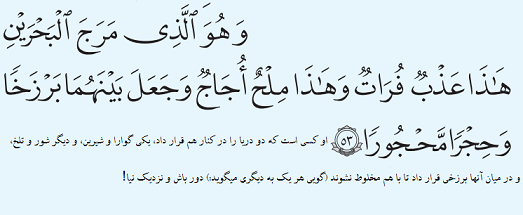 این آیه، یکی دیگر از مظاهر شگفت انگیز قدرت پروردگار را در جهان آفرینش ترسیم می کند که چگونه یک حجاب نامرئی و حایلِ ناپیدا در میان دریای شور و شیرین است و اجازه نمی دهند آنها با هم آمیخته شوند. البته امروزه ما این را میدانیم که این حجاب نامرئی همان تفاوت درجه غلظت آب شور و شیرین و تفاوت وزن مخصوص آنهاست که سبب می شود تا مدت مدیدی به هم نیامیزند. گرچه بعضی از مفسران، برای پیدا کردن چنین دو دریایی در روی کره زمین به زحمت افتاده اند، این مشکل برای ما حل شده است؛ زیرا می دانیم که تمام رودخانه های عظیم آب شیرین که دریاها می ریزند، در کنار ساحل، دریایی از آب شیرین تشکیل می دهند و آبهای شور را به عقب می رانند و تا مسافت زیادی این وضع ادامه دارد و به خاطر تفاوت درجه غلظت با یکدیگر مخلوط نمی شوند.